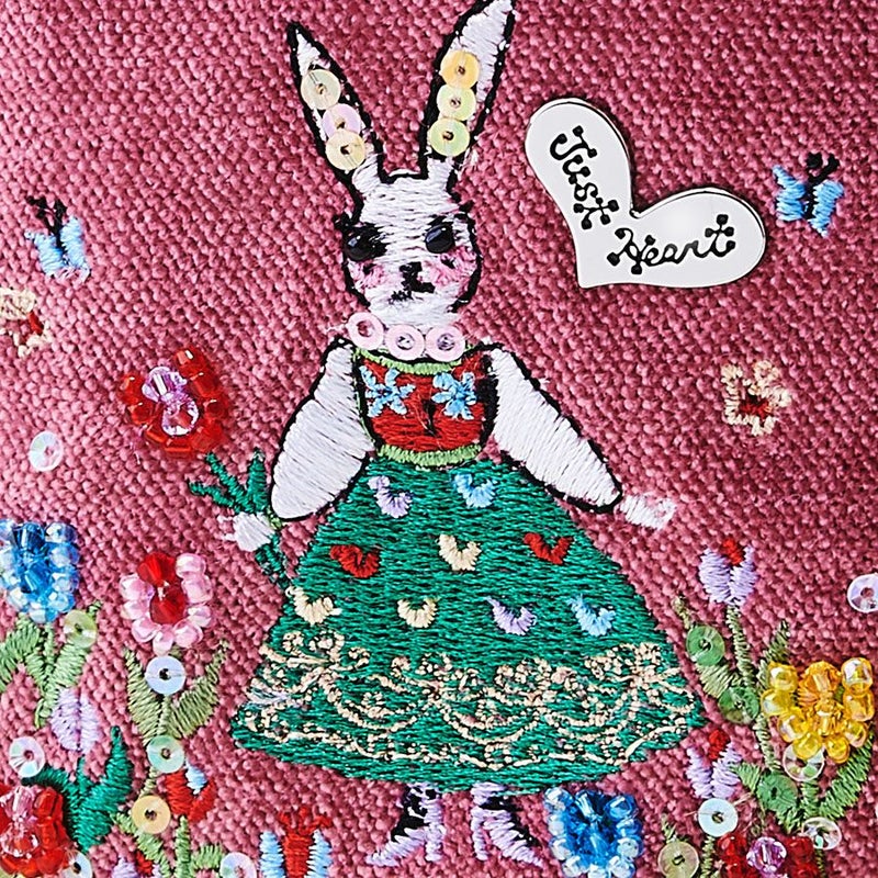 素敵な衣装で着飾った、つぶらな瞳の白うさぎをミシン刺繍で表現。
