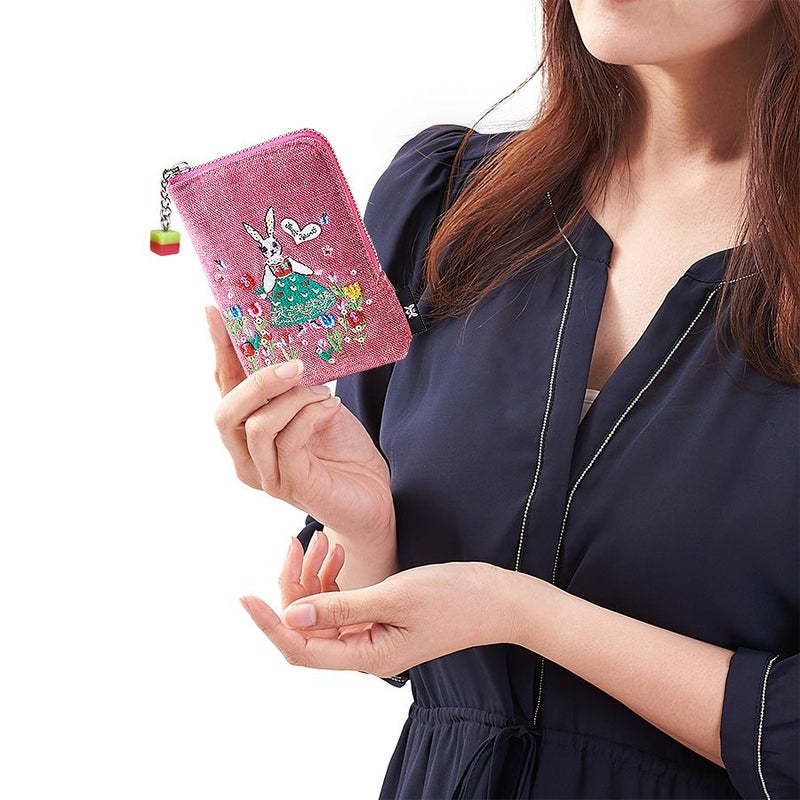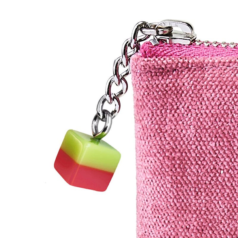 ポップなキューブ型引手チャームがポイントの、ちょっぴりメルヘンな縦長型ポーチです。