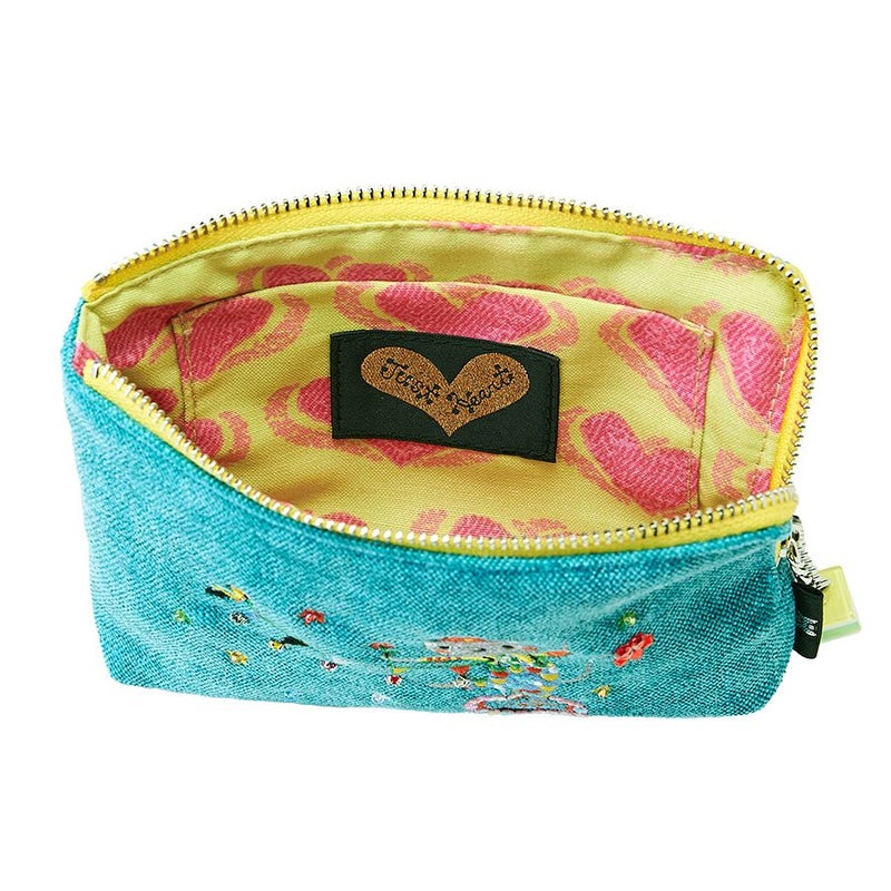 内側にはカードがすっぽり入るサイズのオープンポケット付きで、裏地はイエローベースにピンクのハート柄でポップに。