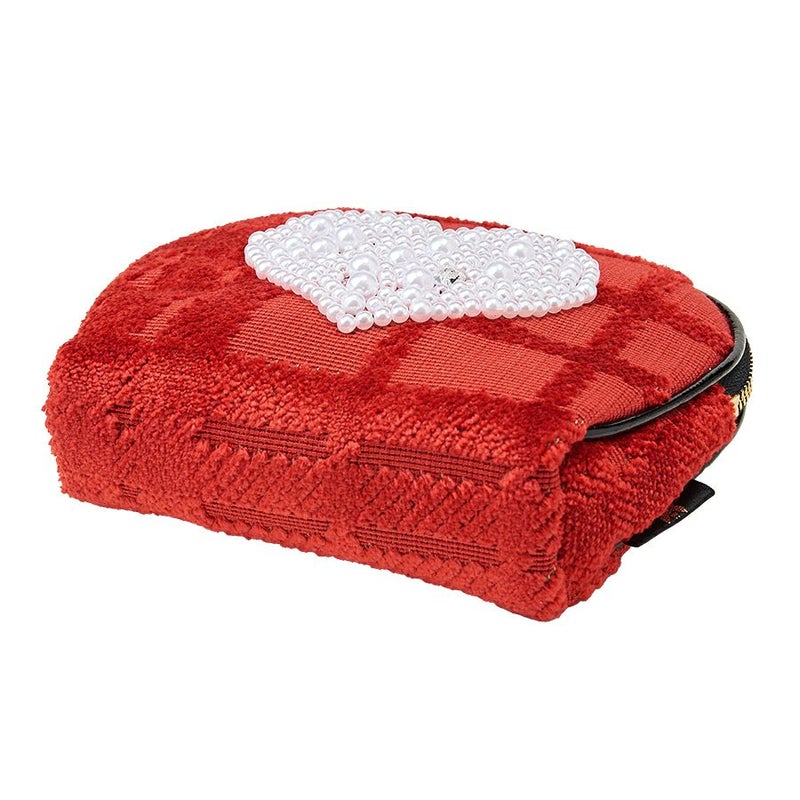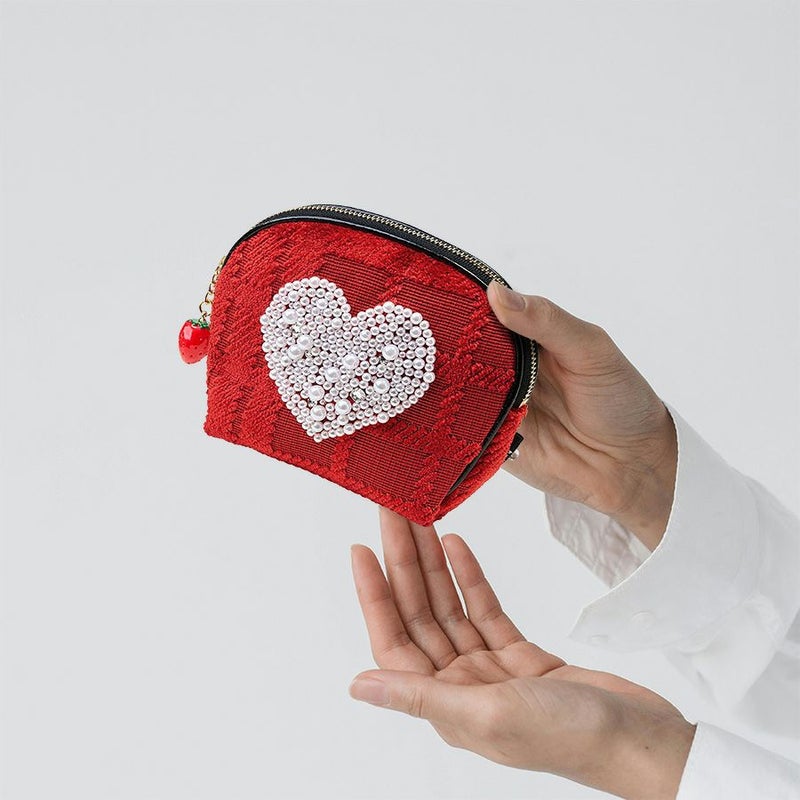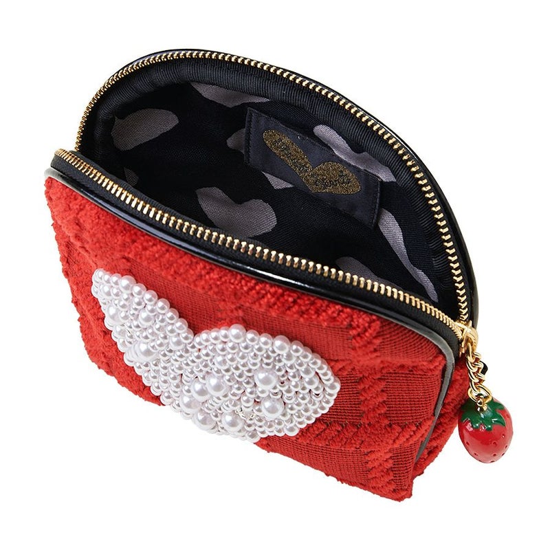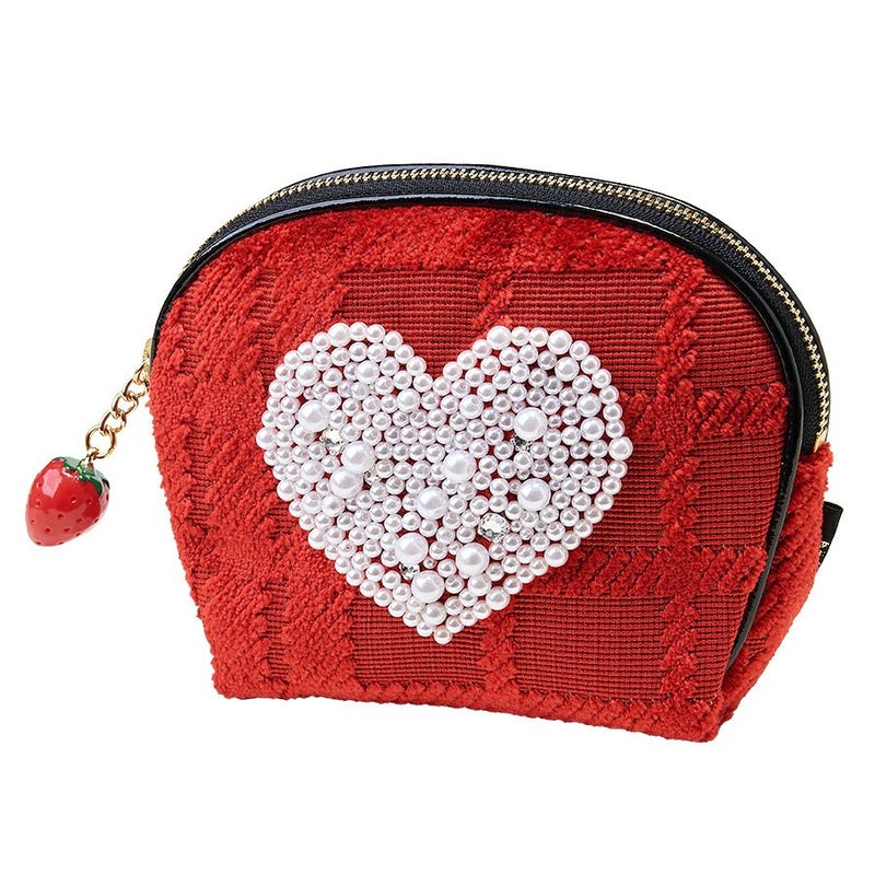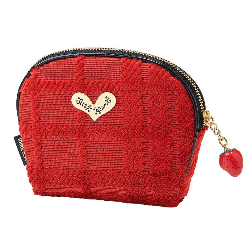 チェックを立体的に表現した織生地と苺のチャームとの一体感で可愛さ満点。