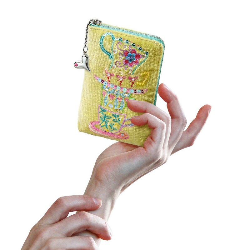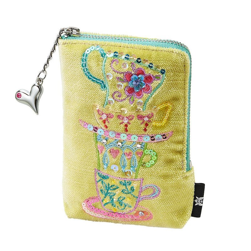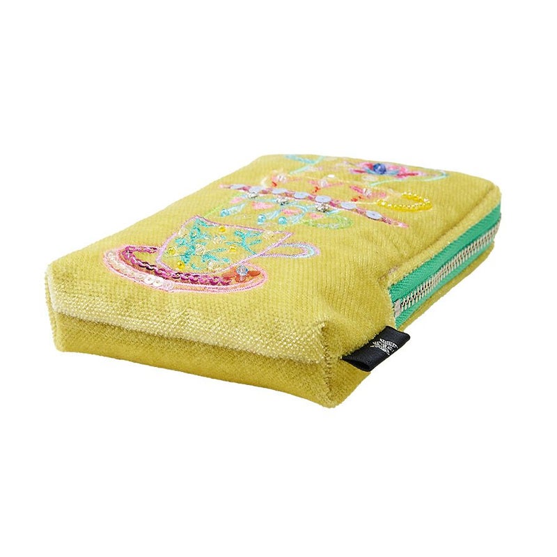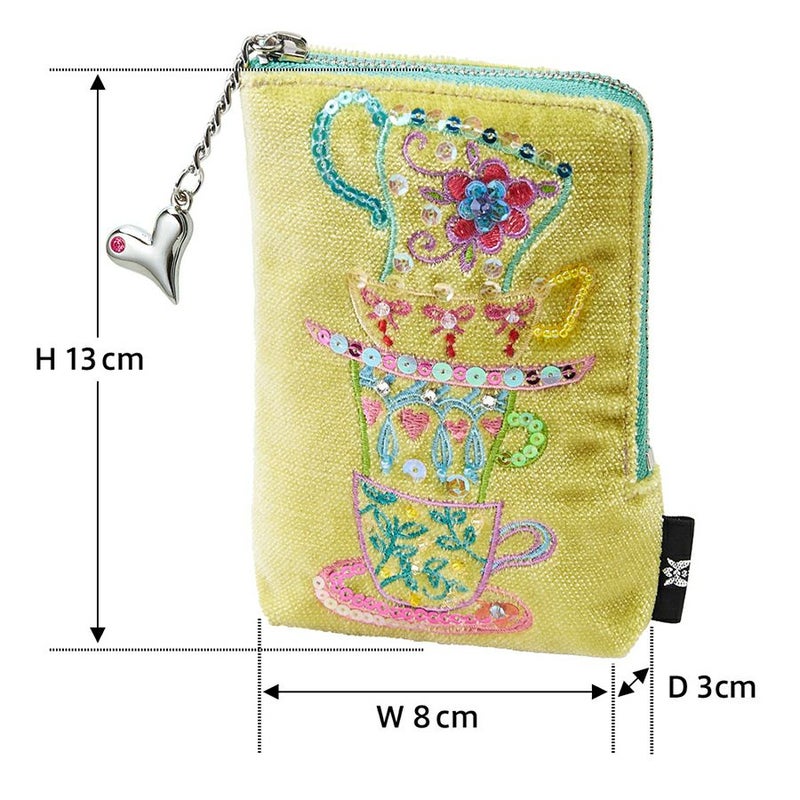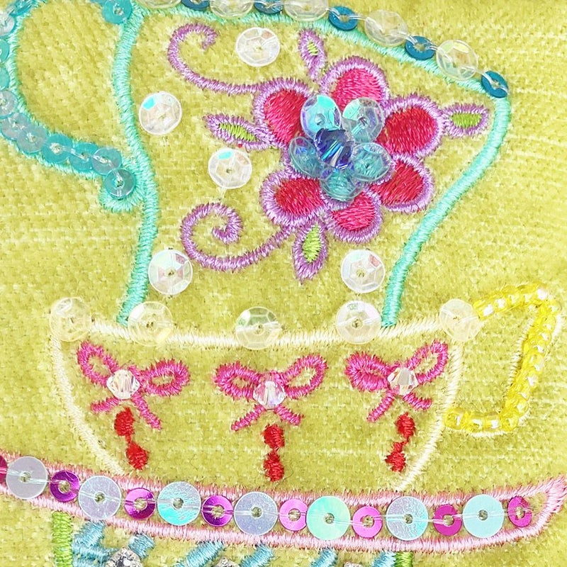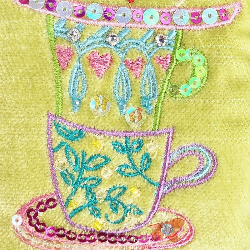 ほんのり光沢のあるイタリア製生地に気分が明るくなりそうなカップ&ソーサーをミシン刺繍でカラフルな糸でかたどり、さらに華やかにスパンコールとクリスタルガラスで彩りました。