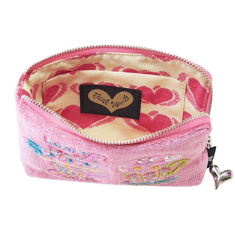 内側はベージュにピンクのハートプリント生地でキュートに。カードがすっぽり入るサイズのオープンポケットが付いています。