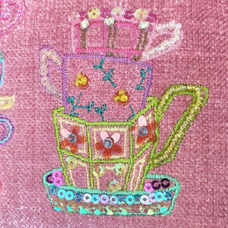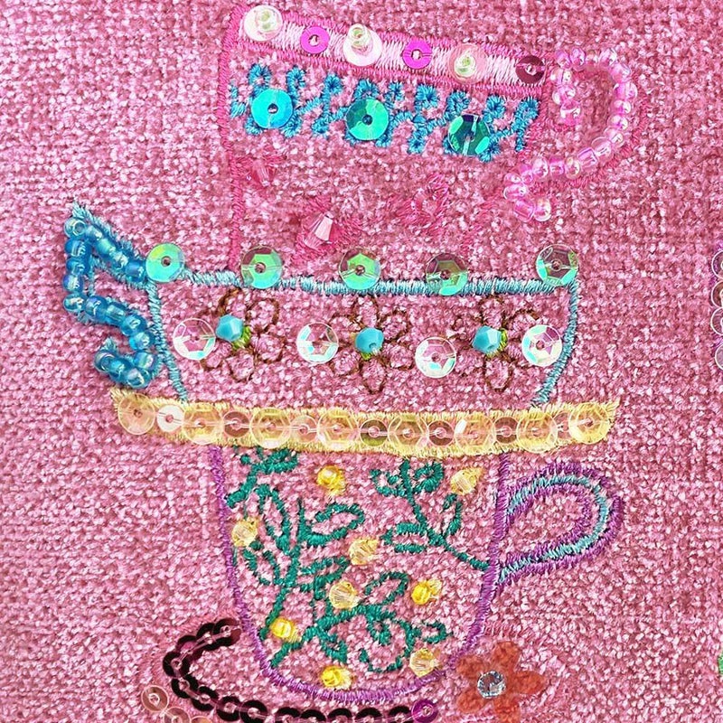 ほんのり光沢のあるイタリア製生地に、気分が明るくなりそうなカップ&ソーサーをミシン刺繍でカラフルな糸でかたどり、さらに華やかにスパンコールとクリスタルガラスで彩りました。