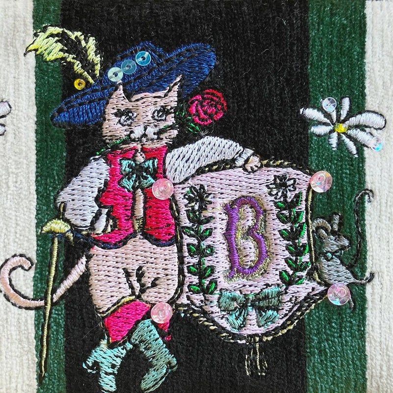 得意げな表情がユーモラスな主人公のネコにスパンコールとビーズでアクセントをつけました。