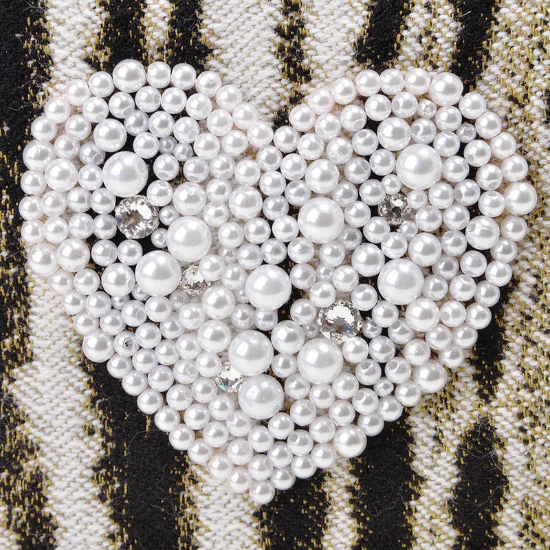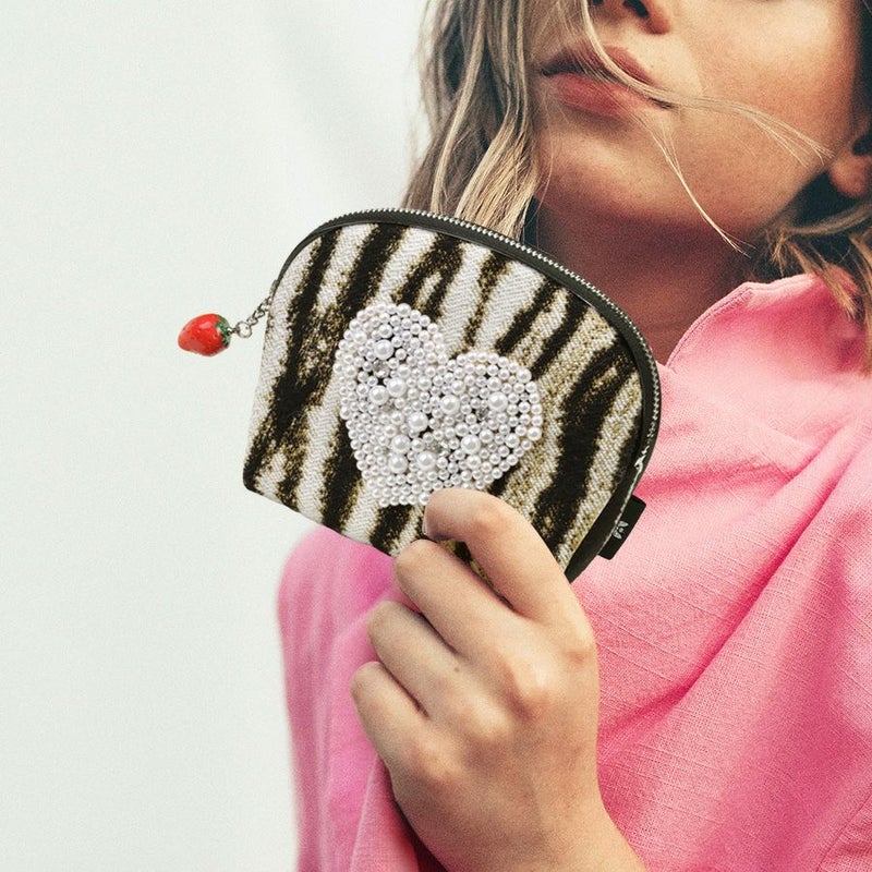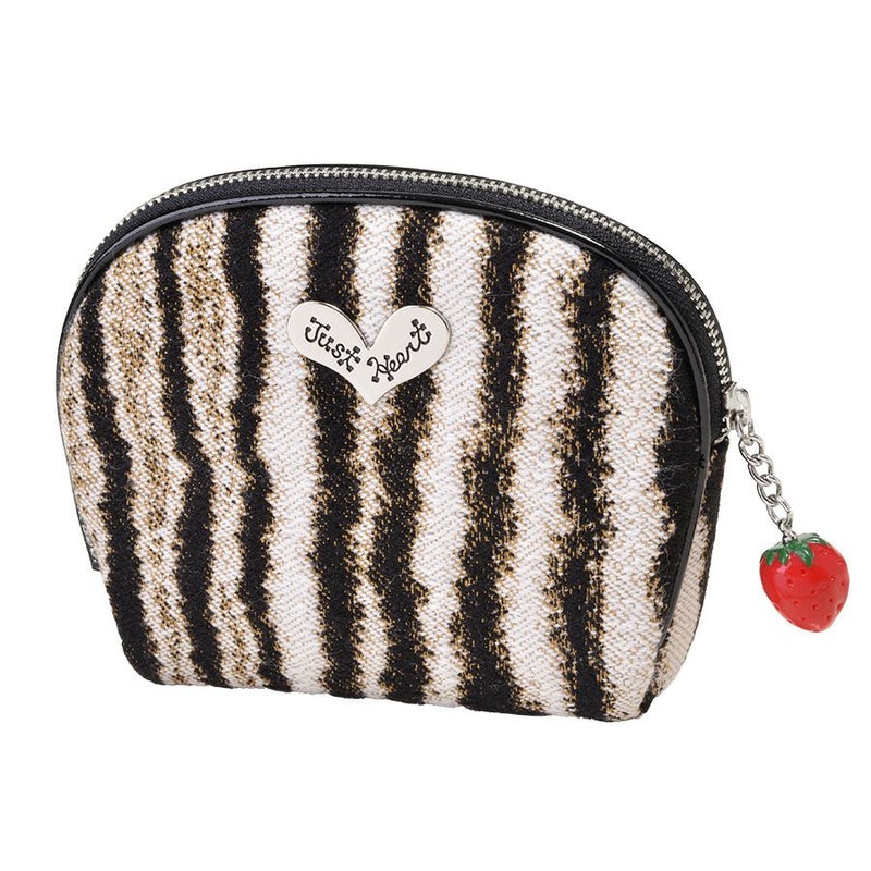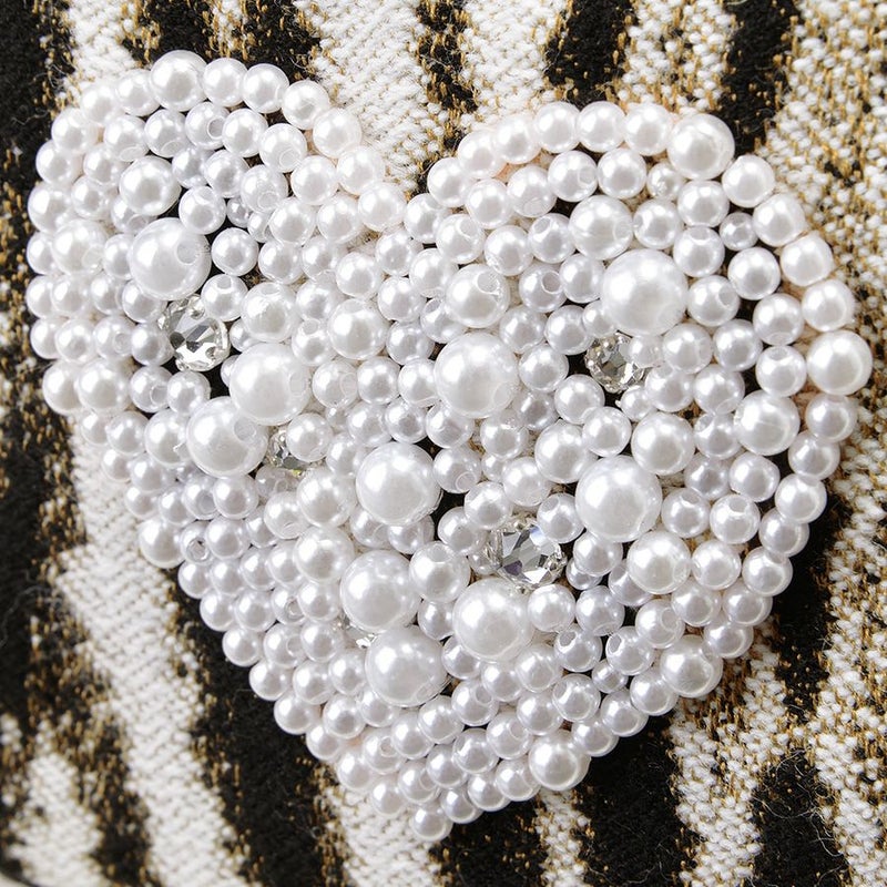 このワイルドなゼブラ柄生地に立体的なハート型の装飾と苺のチャームでキュートをプラスした甘辛MIX。