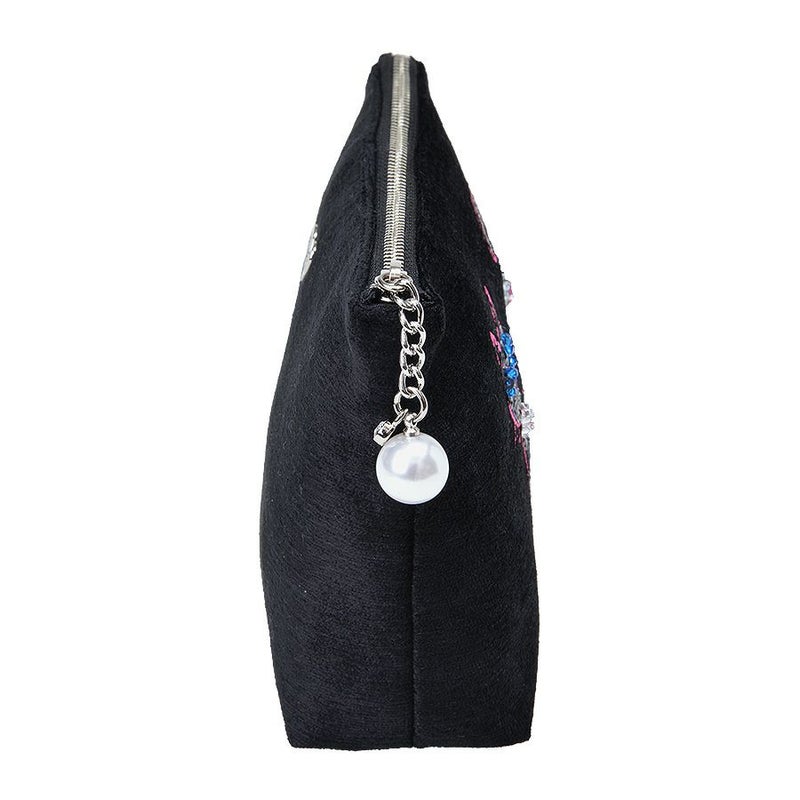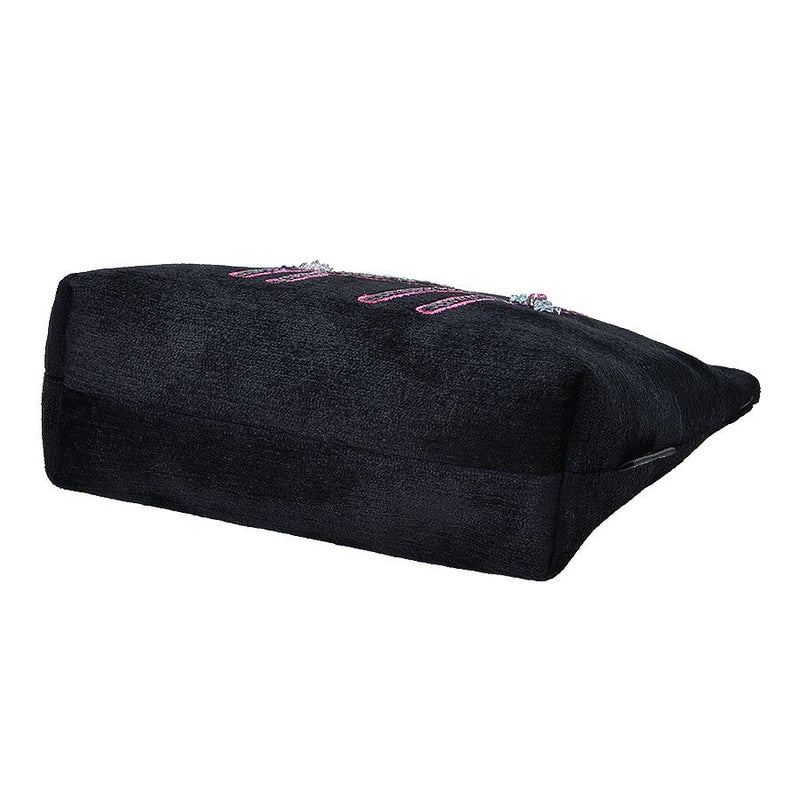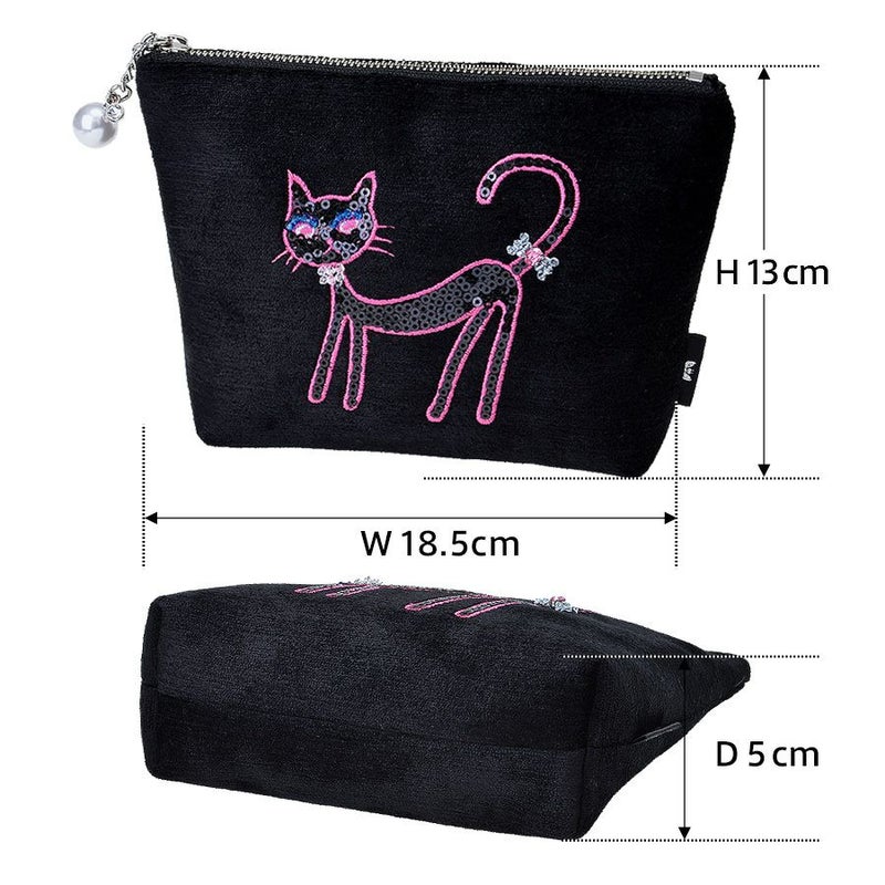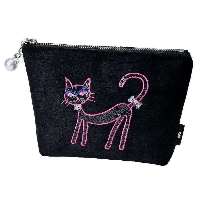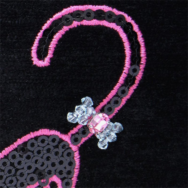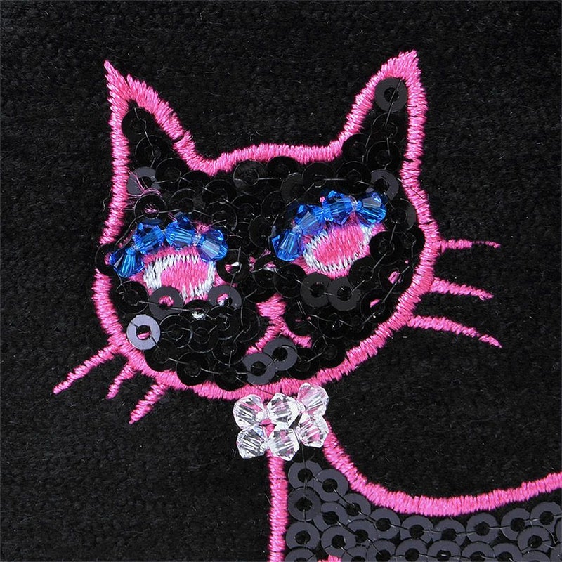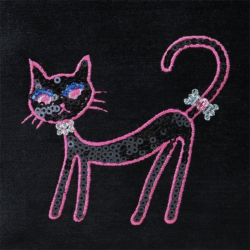 ほんのり光沢のある柔らかなトルコ製のブラック生地に、凛とした佇まいの黒猫をビビッドなピンクのミシン刺繍で描き、毛並みをスパンコール刺繍で表現しました。