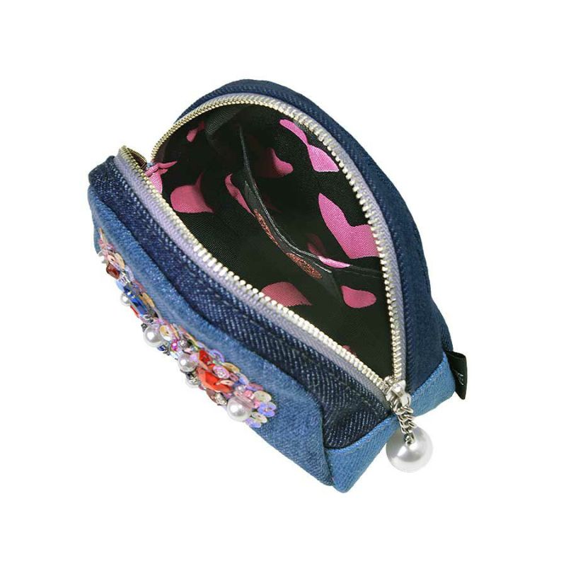 選び抜かれた3面のカラーバランスと、表面の装飾とのマッチングで小さいながらも存在感のあるキュートなポーチです。