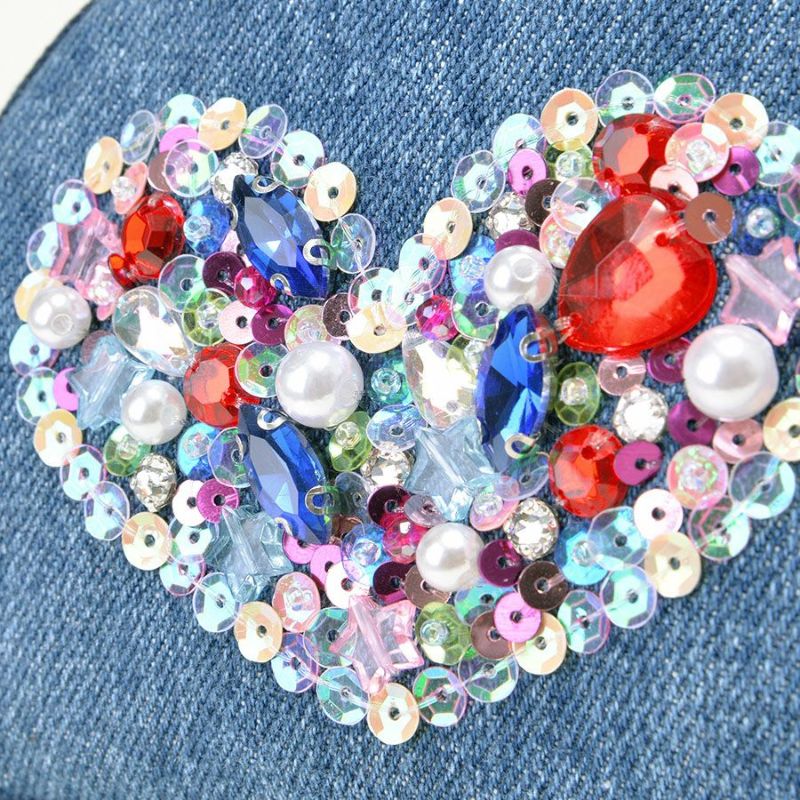 ときめかずにはいられない、オーロラカラーのスパンコールで縁取った、ぎっしり詰まった煌めくハートモチーフはデニムとも好相性。