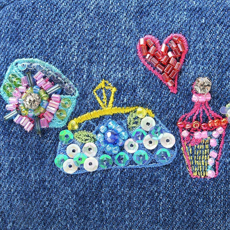ミシン刺繍の上からそれぞれのモチーフに合わせて、ビーズやスパンコールを手刺繍で丁寧に施しました。