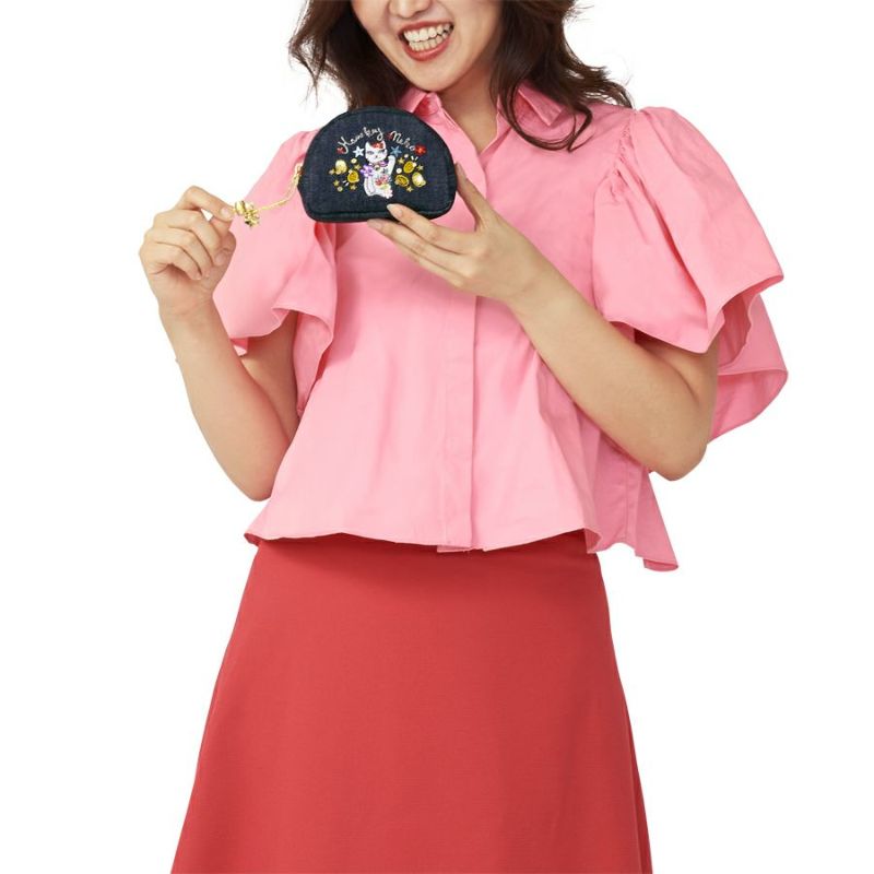 縁起のよい「まねき猫」のオリジナルイラストを刺繍で描いたポーチ。「人を呼びこむ」といわれる左手をあげた、招き猫の周りには星や花、小判などをキュートにちりばめて。背面の打出の小槌の刺繍も、可愛らしいワンポイントです。