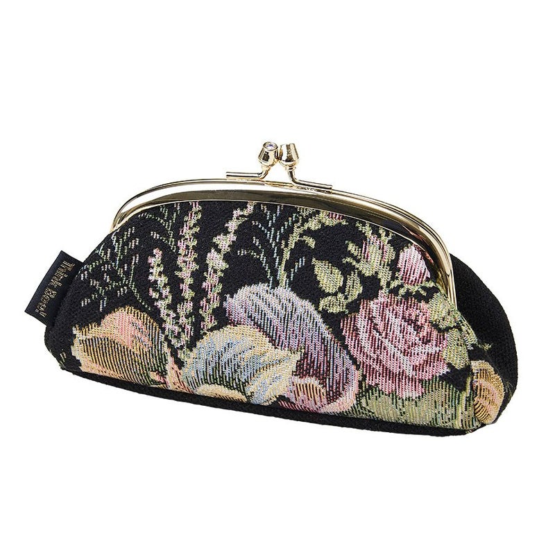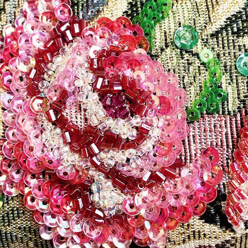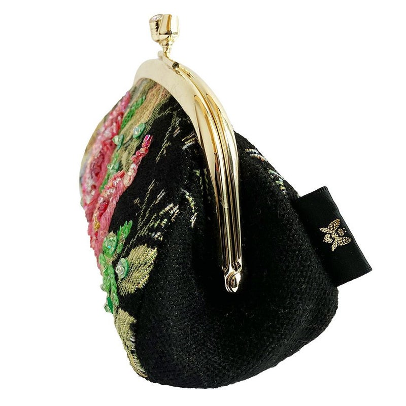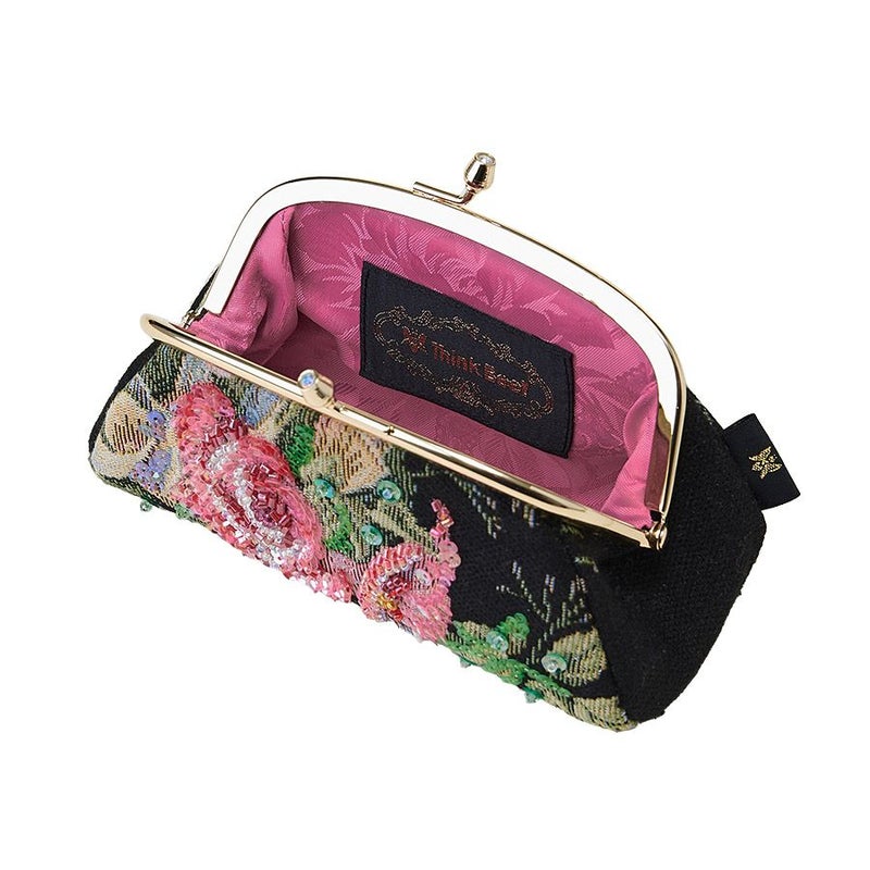 イタリア製のゴブラン織生地にビーズ・スパンコールを贅沢に手刺繍することで、立体的でボリュームたっぷりのデコレーションが美しい。花々の煌めきがエレガントな口金ポーチです。