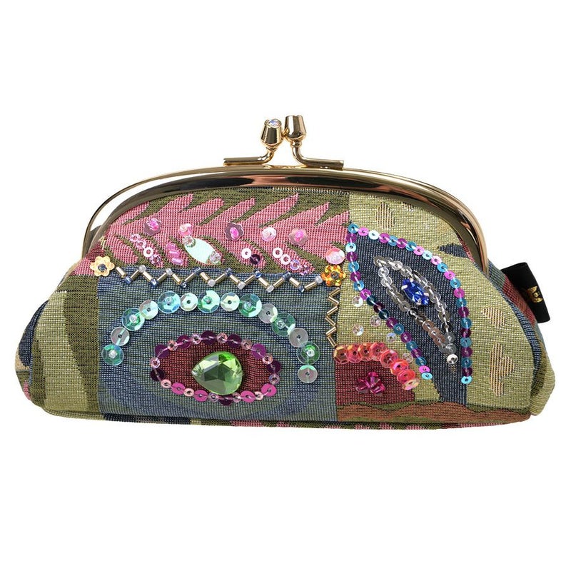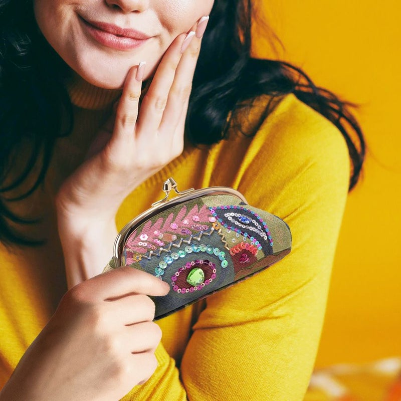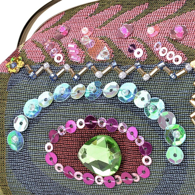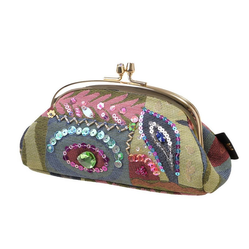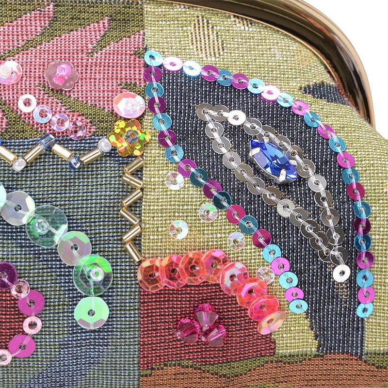 前面には幾何学柄を際立たせる煌めき装飾、クリスタルガラスの存在感をポイントに、手刺繍で丁寧かつ繊細にビーズやスパンコールで華やかにデコレーションした口金ポーチです。