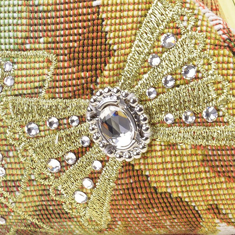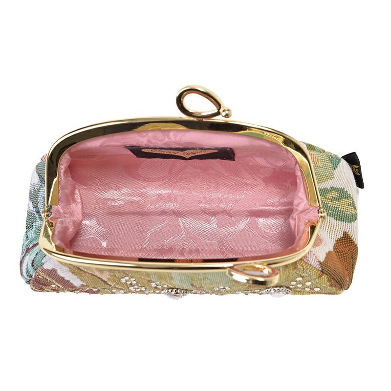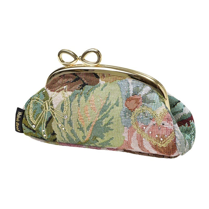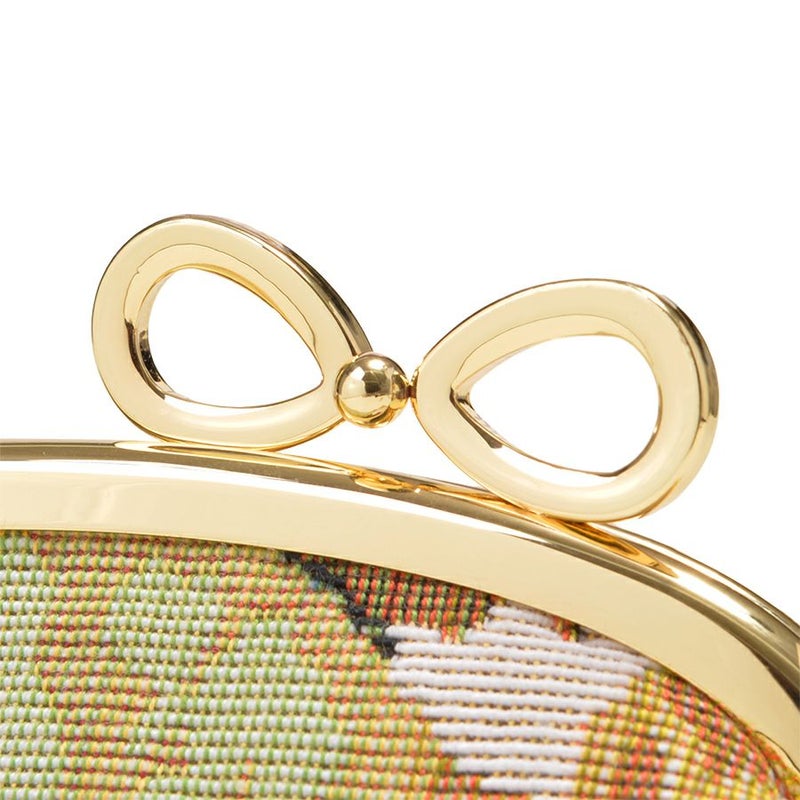 | 素材 | | 表地原産国 | イタリア | | 表地 | コットン87%・ポリエステル13% | | 裏地 | ポリエステル100% | | 内側/付属 | - | | その他 | クリスタルガラス | | サイズ(約) | | 本体(突起部を除く最大) | H 7.5 × W 15 × D 5 cm | | ハンドル立ち上がり | -/- | | ショルダーストラップ長さ | -/- | | 重さ | 85g | | | 仕様 | | 開口部 | 口金式 | | 内側 | - | | 外側 | - | | その他 | 作品により柄の出方や装飾が異なる場合があります 表面片側に