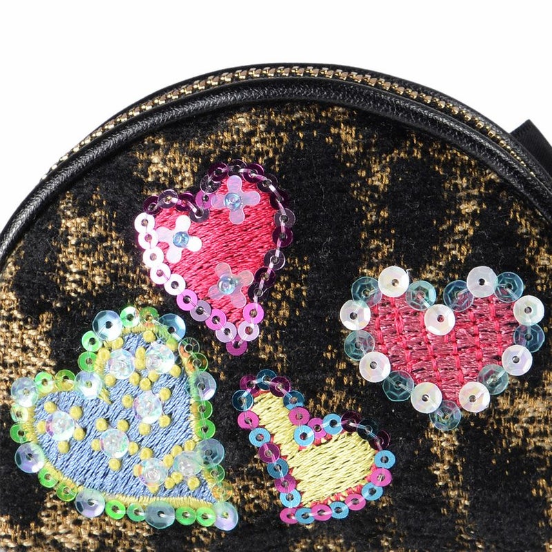 前面に色とりどりのミシン刺繍をハート型に施し、ビーズ、スパンコールをポップな感覚であしらっています。