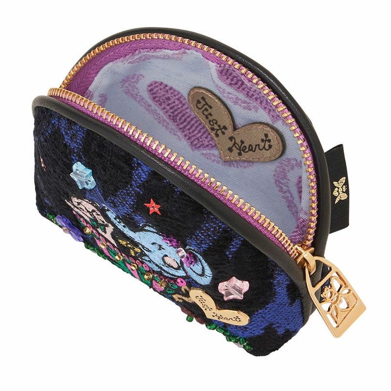 ファスナーを開けると、内側は爽やかなブルー地にパープルのハートプリント生地。