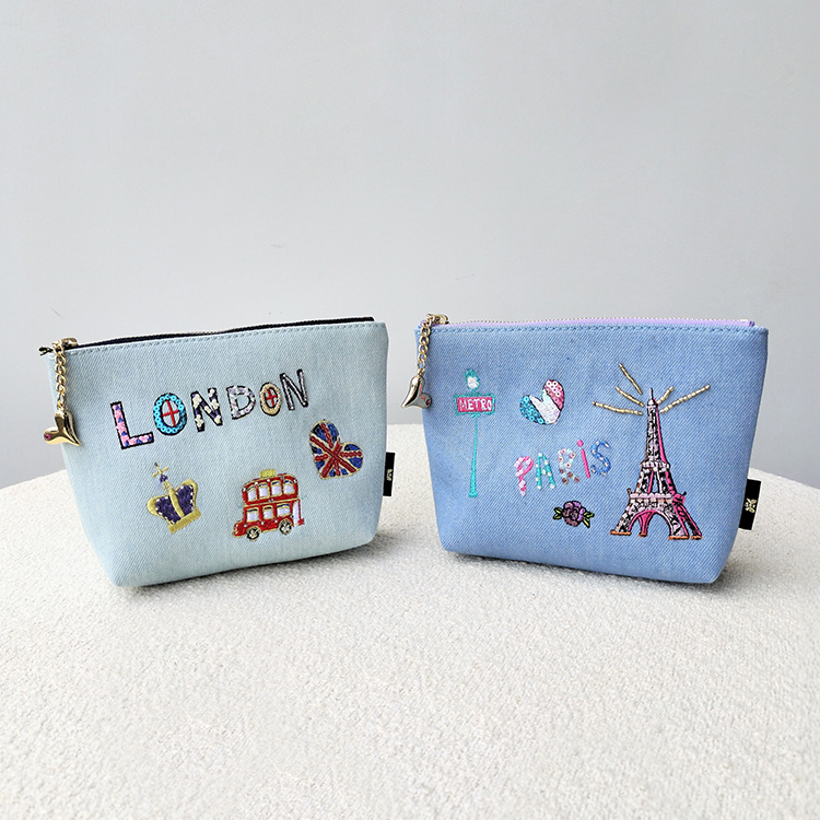 やわらかな岡山県産デニムに、ビーズ・スパンコール・クリスタルガラスを使ったきらきら刺繍のモチーフが表も裏もたっぷり!