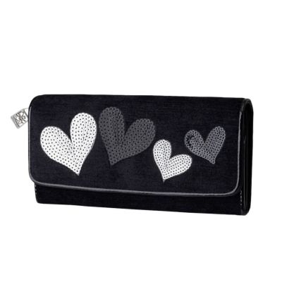 銀座直営店限定のロックハートラージショルダーバッグとお揃いで持っています。 ハート柄が大好きで、でも、このシリーズは甘くなりすぎず、でも主張するところはしっかり主張する、そんなデザインで大好きです。 カード入れも沢山あり、小銭入れがL字型にファスナーが開くので、とても見やすいです。 そんなに仕切は要らないかなあ、とも思いますが、何かと便利そうです。光を吸収するベロア素材に、キンキラのスパンコールのハートがとても綺麗に映えます。 私はいつもバッグと財布はお揃いで持ちたいので、今回再発売して下さってとても嬉しいです。