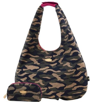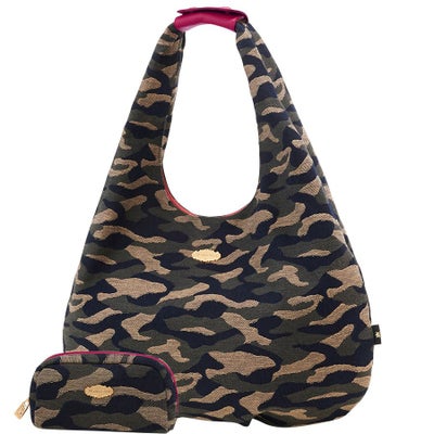 迷彩柄ですが、裏地と持ち手のカラーでハードな印象が柔らかくなり気分が上がります。 そして何よりもたくさん入るサイズ! Think Bee!さんの商品は比較的小さめサイズが多い中、このサイズ感は嬉しいですね。 付属のポーチも良きです。