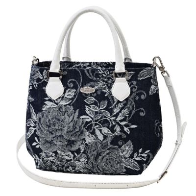 一目見て使い勝手が良さそうなバックだと思いました。 ビーズや刺繍の飾りが一切なく紺の薔薇柄のデニム地に白い革のハンドルとショルダーが爽やかで夏らしいです。 軽くて物の出し入れもしやすく、普段使いはもちろん、キチンとした印象もあるのでよそ行きでもいいし、素敵なバックです。
