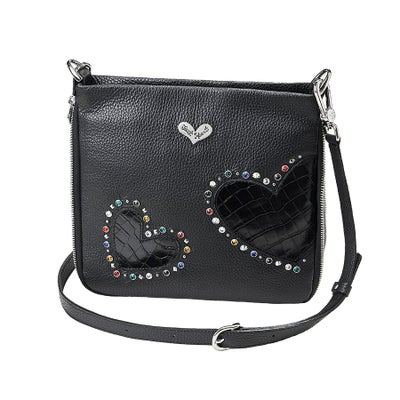 母が自分のお出掛け用にと購入しました。ショルダーバッグを探していて、色々と見て回ってこのショルダーバッグにたどり着きました。ただ黒いだけのは嫌。とハート型に縁取られた色鮮やかなスワロフスキー・クリスタルと、色んな形のスタッズでカラフルなアクセントを効かせたデザインも派手すぎず良い!と大変気に入りました。まちもあり長財布、携帯、メガネ、ポーチ、車の鍵まで入りました。身長が低いので調整ひもの長さが長かったのでもうひとつ穴が空いていたら良かったのになぁ、、と思いました。 母も気持ちが明るくなり大変気に入っております。