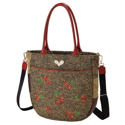 初購入です。とても素敵でした。 インターネットでツイードっぽい生地の質感や赤の差し色が気になり購入しました。 手に取ってみてみると生地の色や質感がすごく凝っていて見ていて飽きません。ますます好きになりました。 表地のメインの織物は黒っぽい色と黄色とオレンジ色と緑色で構成されていて、遠くから見るとからし色っぽく感じるモザイクに見えます。 生地だけ見ていると重厚感があって大人っぽい印象ですが、サイドの質感違いのパッチワークやサクランボやハンドルの赤があるので明るくて遊びっぽい感じがします。 織物で奥行きがあるせいか室内環境ではキラキラのサクランボは意外なほど目立たないのですが、光が当たるとキラキラして茶目っ気があります。
