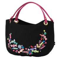 刺繍がとても可愛いです。持ち手がピンクでアクセントになり、気に入りました。大容量で、かなりたくさん入ります。